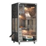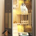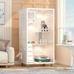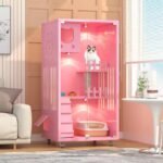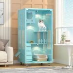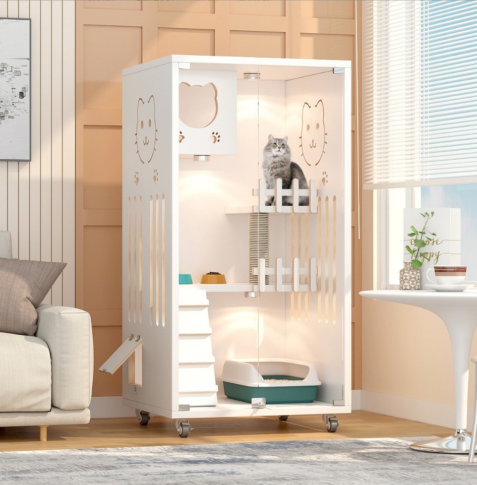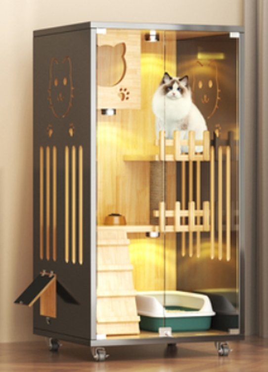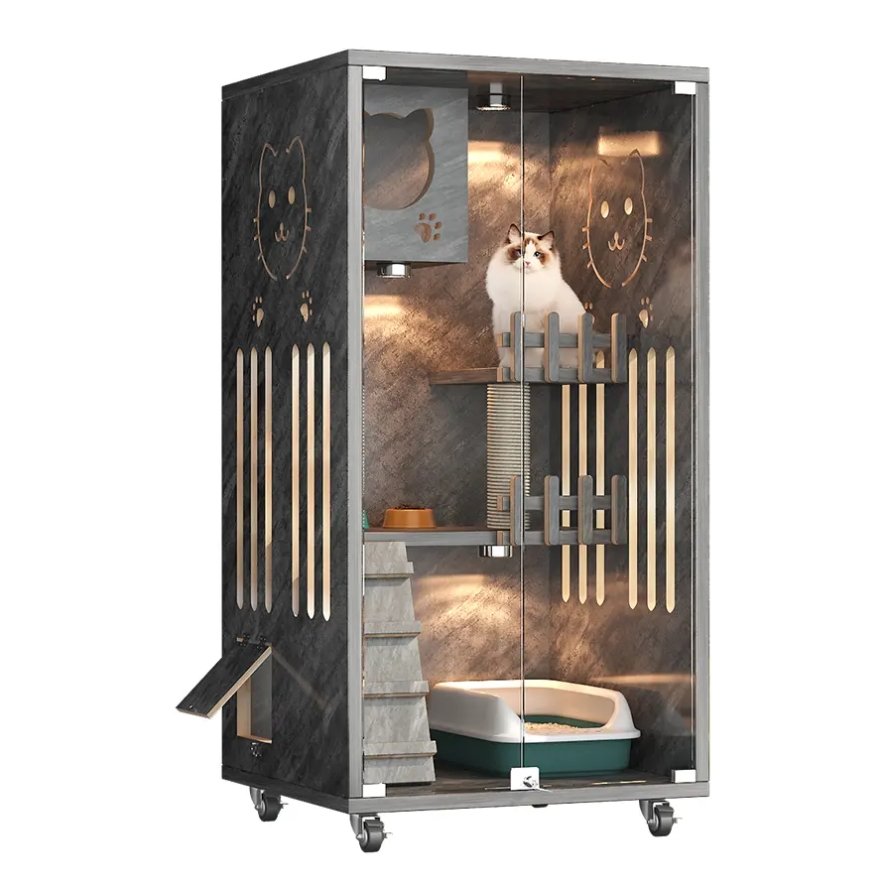 Casa para gatos de madera maciza de lujo con espacio extra grande, perfecta para el descanso y el sueño de las mascotas. Cuenta con un diseño colorido, material de madera de alta calidad, rascador, cucha, luces en el interior, puerta de vidrio con llave, ventilación en los costados y puerta lateral pequeña para entrada y salida.