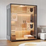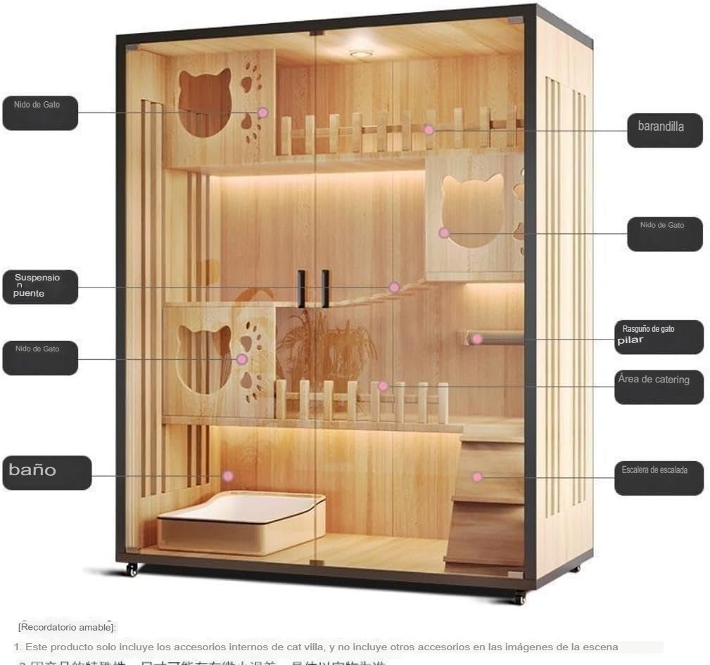 Casa para gatos de madera maciza de lujo con espacio extra grande, perfecta para el descanso y el sueño de las mascotas. Cuenta con material de madera de alta calidad, dos rascadores, tres cuchas, luces en el interior, puerta de vidrio con llave, ventilación en los costados y puerta lateral pequeña para entrada y salida.
