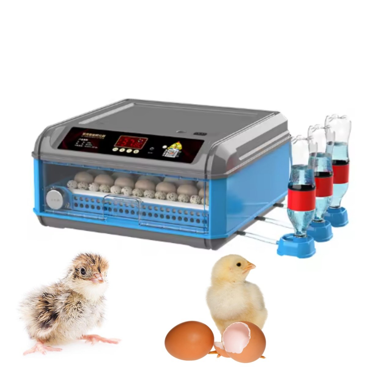 Incubadora con capacidad para 64 huevos.