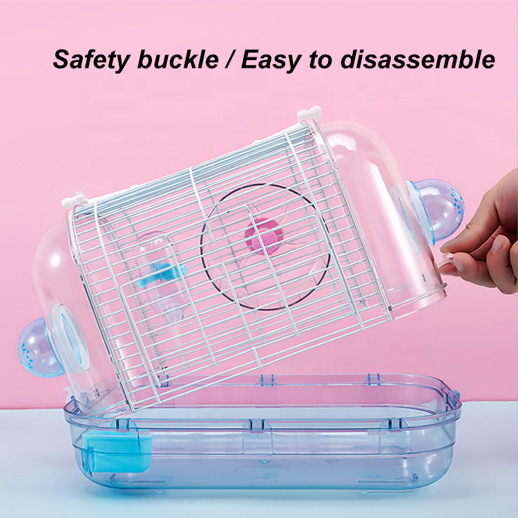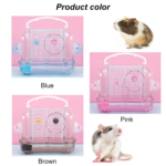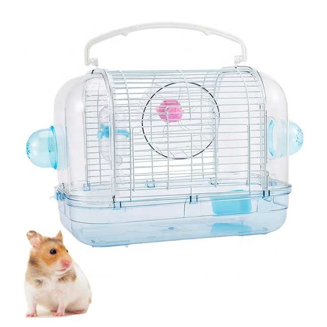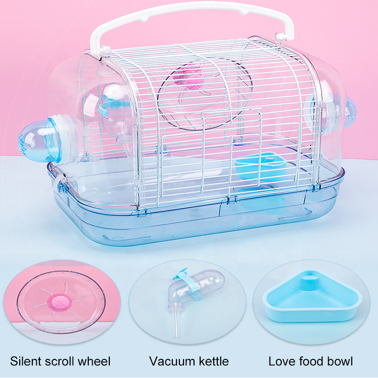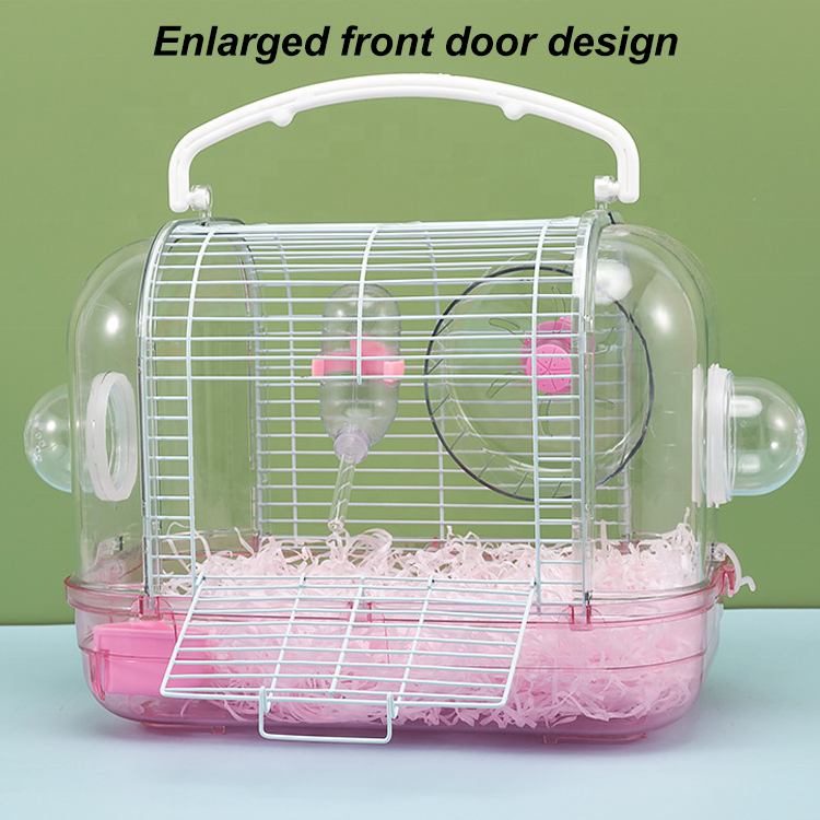 Esta jaula transparente para hámster está hecha de plástico y alambre ecológicos, ofreciendo una solución portátil y multifuncional para hámsteres u otro roedor de pequeño tamaño. Su diseño de 32 x 21 x 28cm incluye accesorios como un rodillo, una tetera y un tazón de comida. La jaula cuenta con un asa de transporte conveniente, alta transmisión de luz y un diseño de hebilla segura para un fácil ensamblaje.