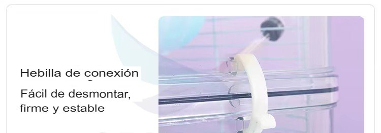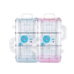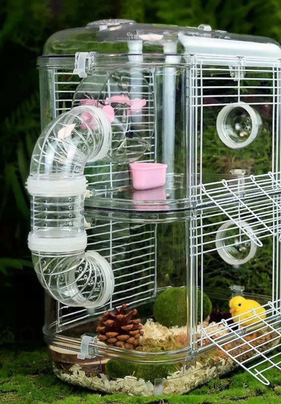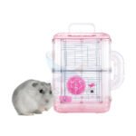 Jaula transparente para hámster hecha de pastico y alambre con dos niveles, ofreciendo un espacio amplio y cómodo para las mascotas. Cuenta con una rueda de ejercicio redonda silenciosa, recipientes de comida extraíbles y una botella de agua para facilitar el mantenimiento. El plástico translúcido y la malla de acero mejoran la ventilación permitiendo observar a las mascotas. Portátil y fácil de llevar, es ideal para viajar.