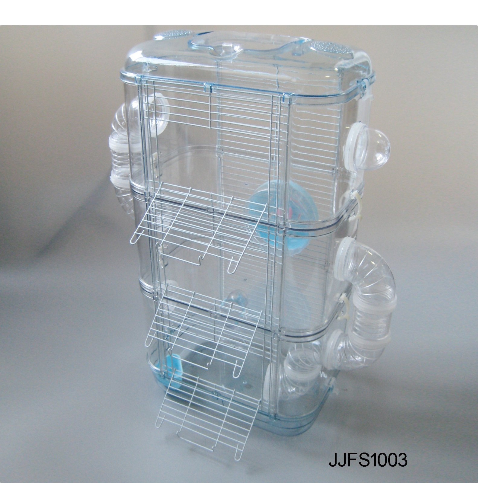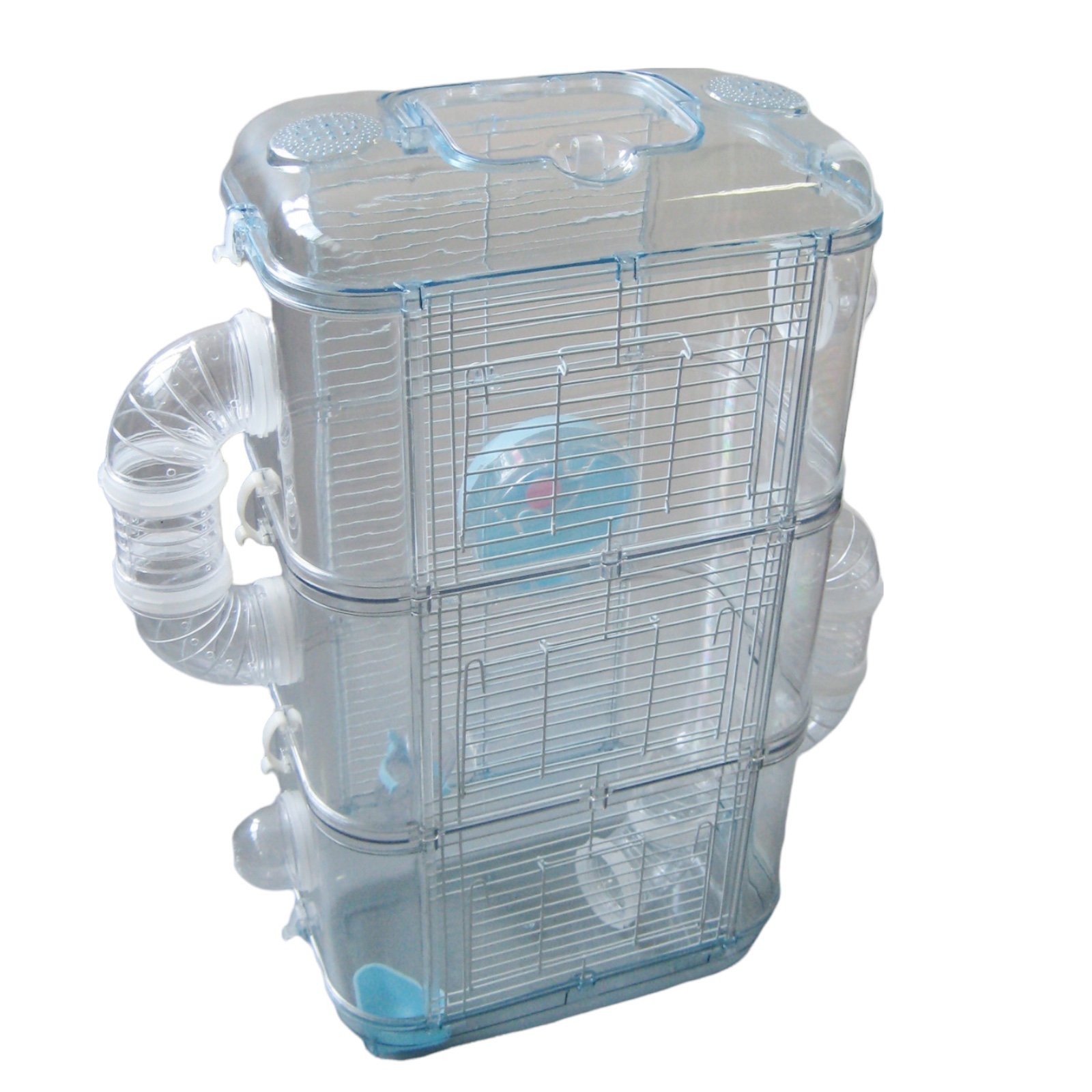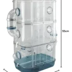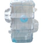 Jaula transparente para hámster hecha de pastico y alambre con tres niveles, ofreciendo un espacio amplio y cómodo para las mascotas. Cuenta con una rueda de ejercicio redonda silenciosa, recipientes de comida extraíbles y una botella de agua para facilitar el mantenimiento. El plástico translúcido y la malla de acero mejoran la ventilación permitiendo observar a las mascotas. Portátil y fácil de llevar, es ideal para viajar.