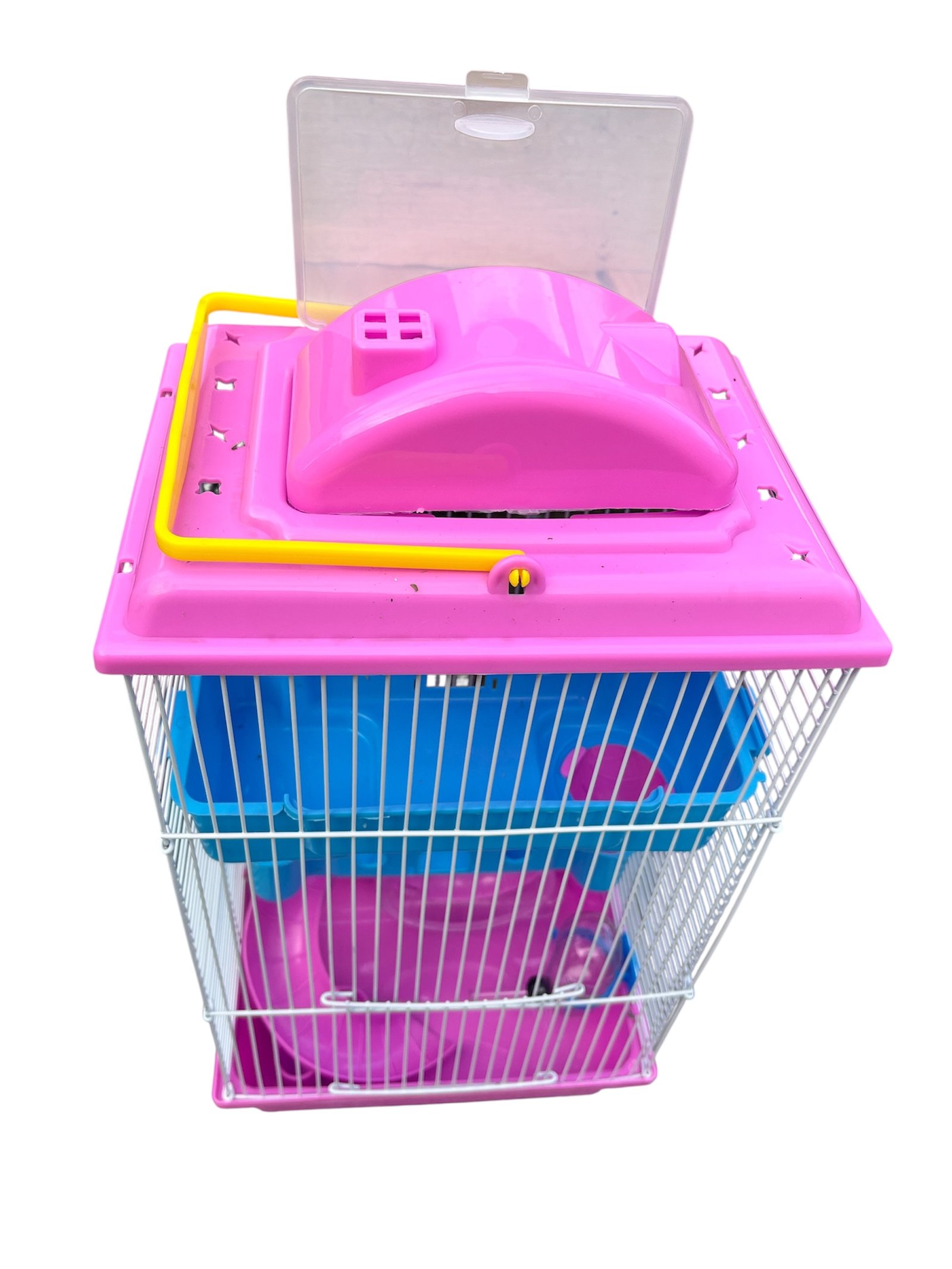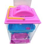 La jaula se divide en plantas superior, intermedia e inferior. La planta superior es el área de descanso principal, la intermedia es el área de juegos principal y la inferior es para comer, beber y jugar. Mantiene el entorno limpio y mantiene la actividad adecuada del hámster para estimular su metabolismo. La jaula incluye comedero, bebedero, rueda de ejercicio, 2 toboganes y casita.